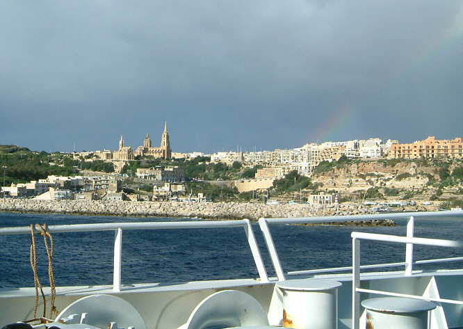Das Bild zeigt die Hafeneinfahrt von Mgarr => |