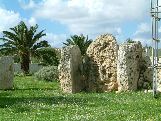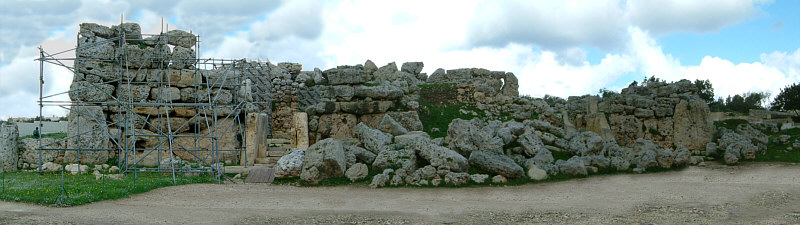 | Die Außenmauern der Anlage sind an einer Stelle noch über 6 Meter hoch. Aufgrund des Volumens der teilweise über 50 Tonnen schweren Steinquader aus Korallenkalkstein ist anzunehmen, dass die Kultstätte ursprünglich höher war. Bis zur Entdeckung der etwa 11.000 Jahre alten Tempel auf dem " Göbekli Tepe" in Ostanatolien galt die Ġgantija zwar als ältester Tempel der Welt (aus bearbeiteten Steinen), aber die Megalithbauten in der Bretagne wie Barnenez sind Jahrhunderte älter.
