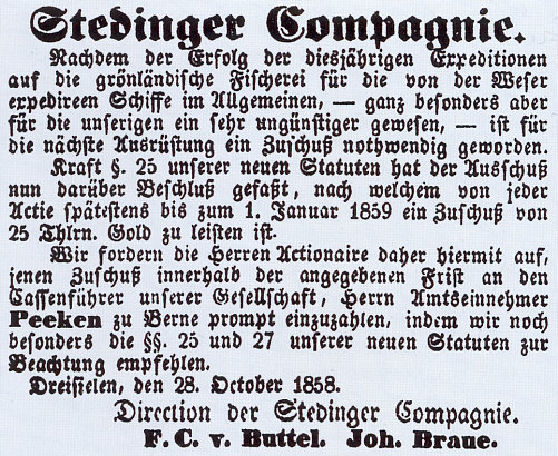 „Es sollen alle finanzkräftigen Einwohner des Stedingerlandes am 21. Oktober 1842 um 16 Uhr im "Jacobsens Gasthof zu Berne" versammeln, um über die Gründung einer Aktiengesellschaft zur Ausrüstung eines Schiffes auf Robbenschlag zu sprechen.“ |